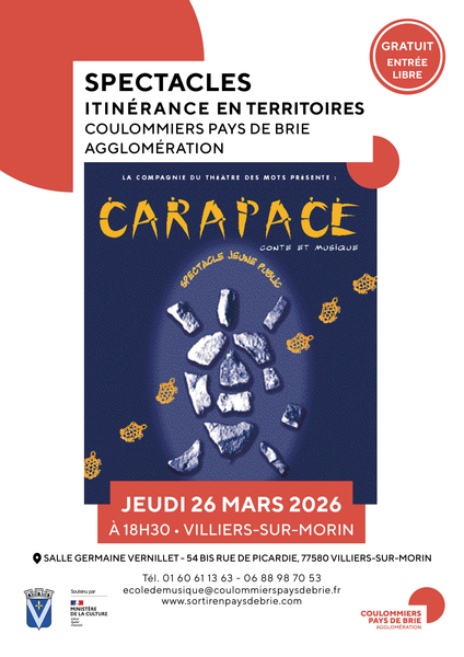 26Mar Spectacle Spectacle « Carapace » Itinérance en Territoires 2026 Villiers-sur-Morin Itinérance en Territoires revient ! Découvrez le premier spectacle « Carapace » interprété par la compagnie « Théâtre des Mots », proposé par la communauté d’agglomération Coulommiers Pays de Brie En savoir plus